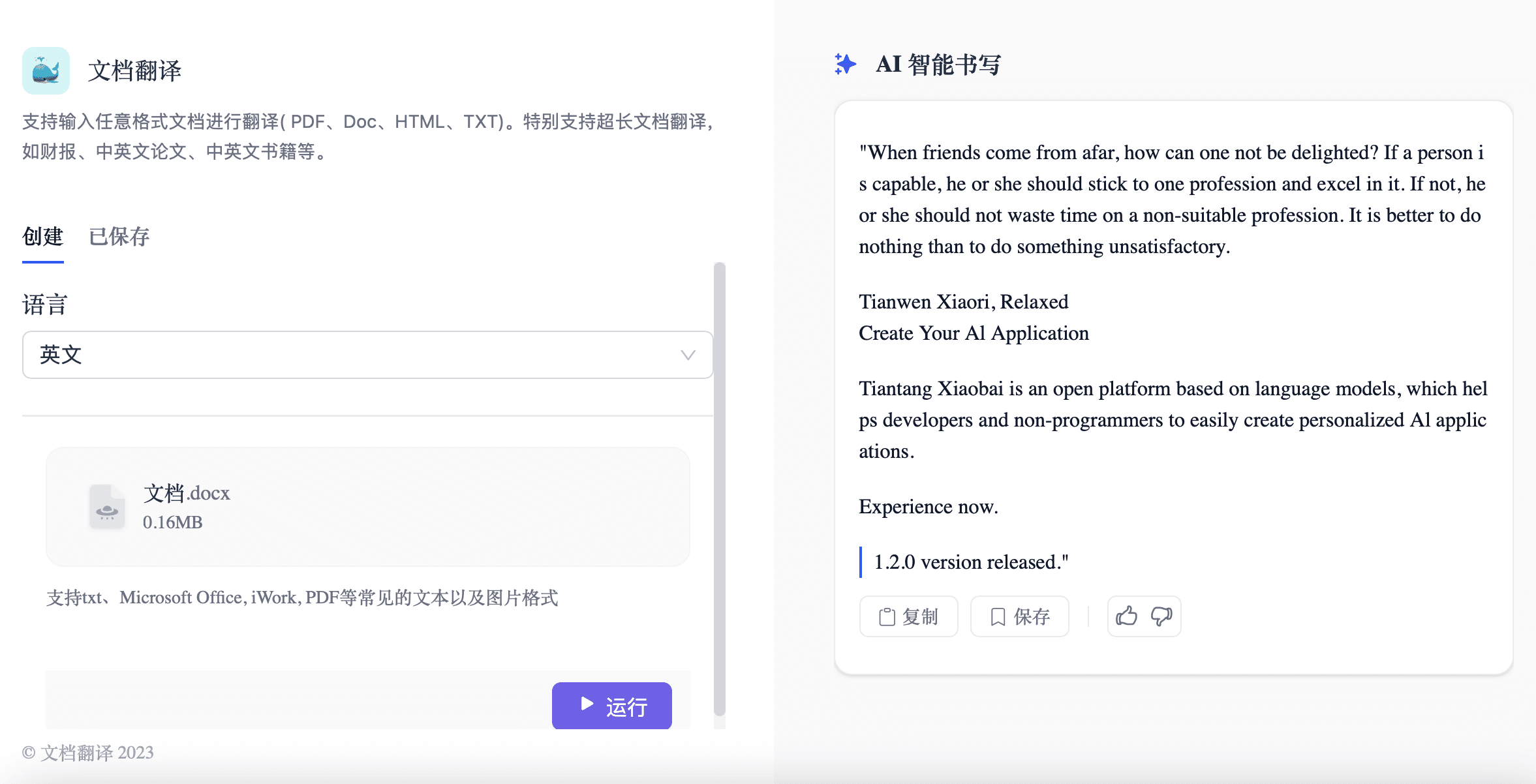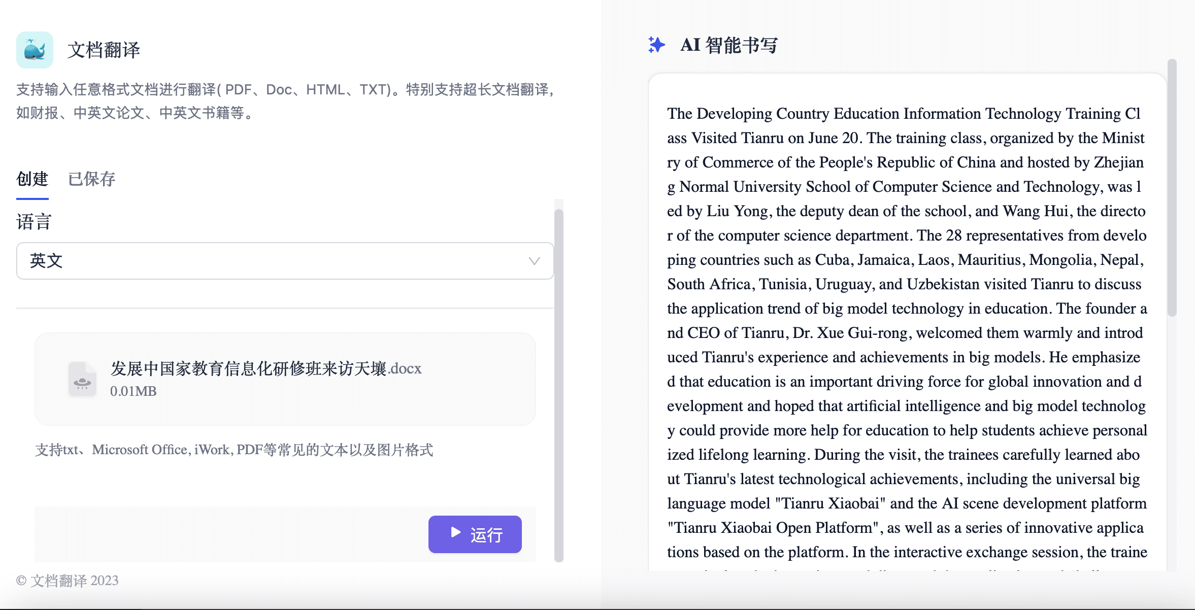 当翻译遇见AI,天壤文档翻译为您的创作提供双语翅膀!支持翻译各类文档格式与图片,告别手动翻译之苦。自动识别文档中的图片文本,无论论文报告还是长篇书籍,通通为翻译难题划上句号!让文档翻译不再难,创作传播无国界,与全球读者零距离连接!