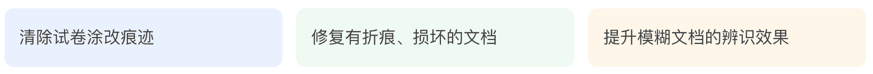 在处理各种复杂情况下都能游刃有余,包括卷曲、阴影、褶皱、污渍、手指遮挡、背面透字以及摩尔纹等试卷图片问题,都能轻松应对,确保输出的试卷整洁无瑕。