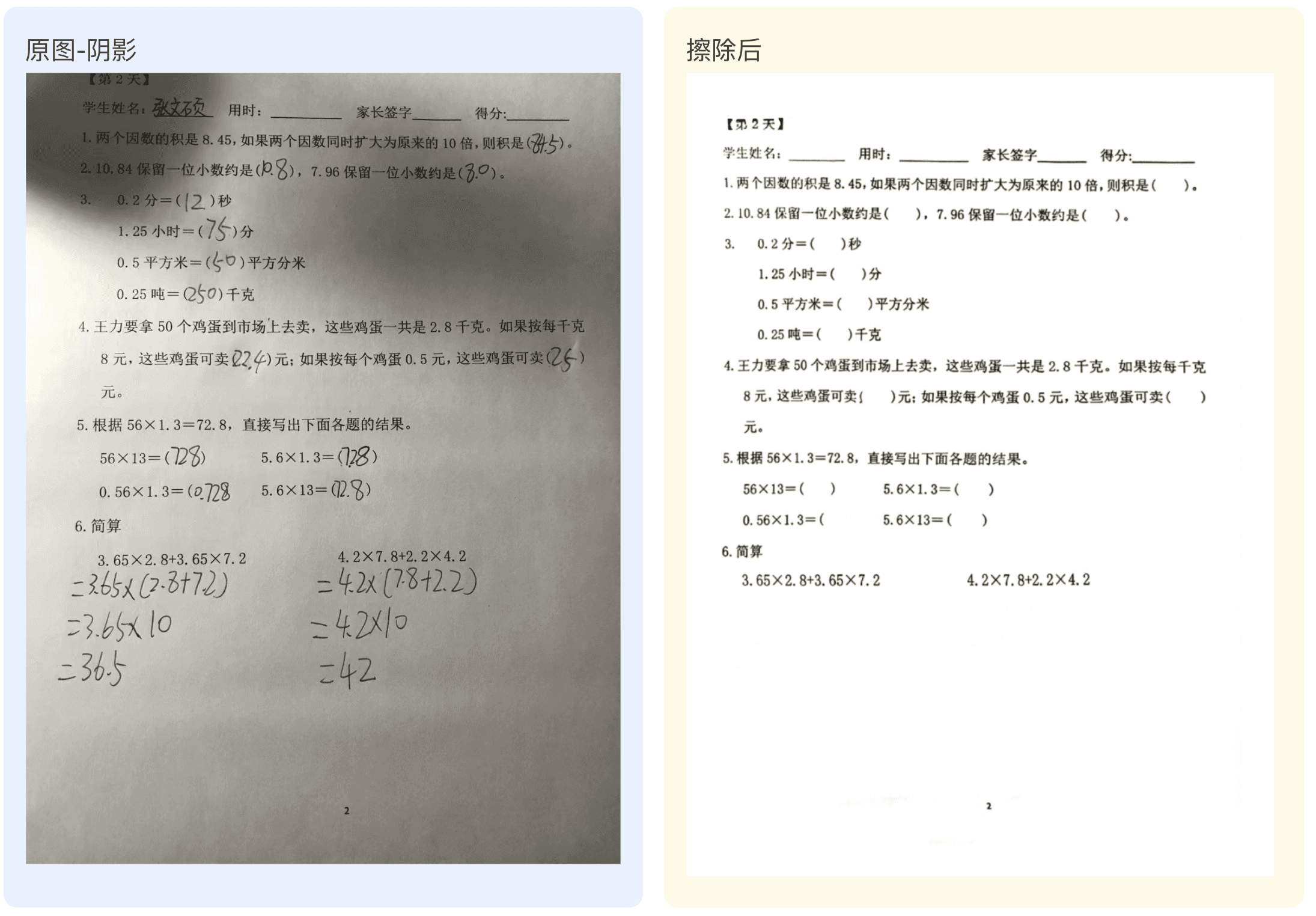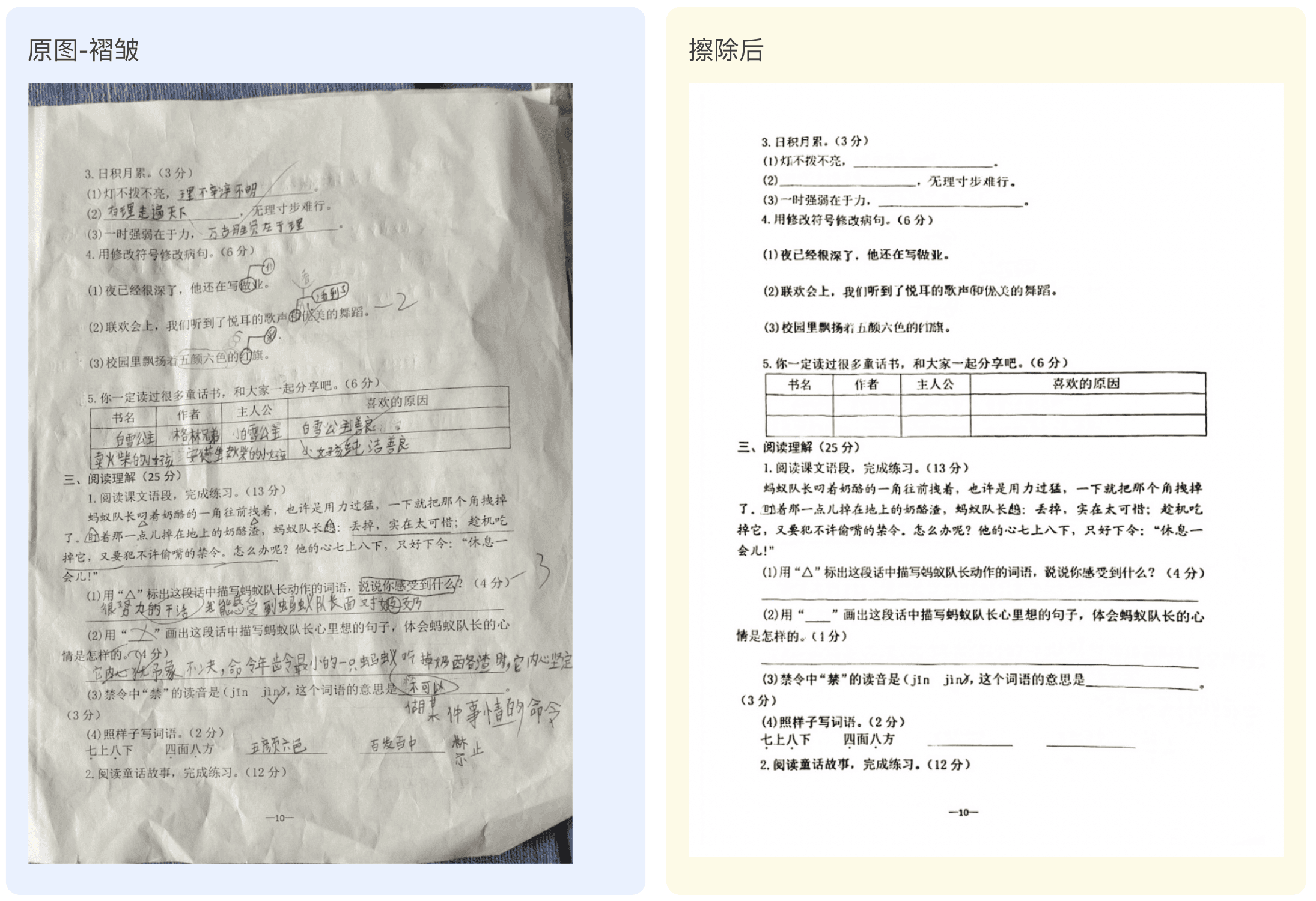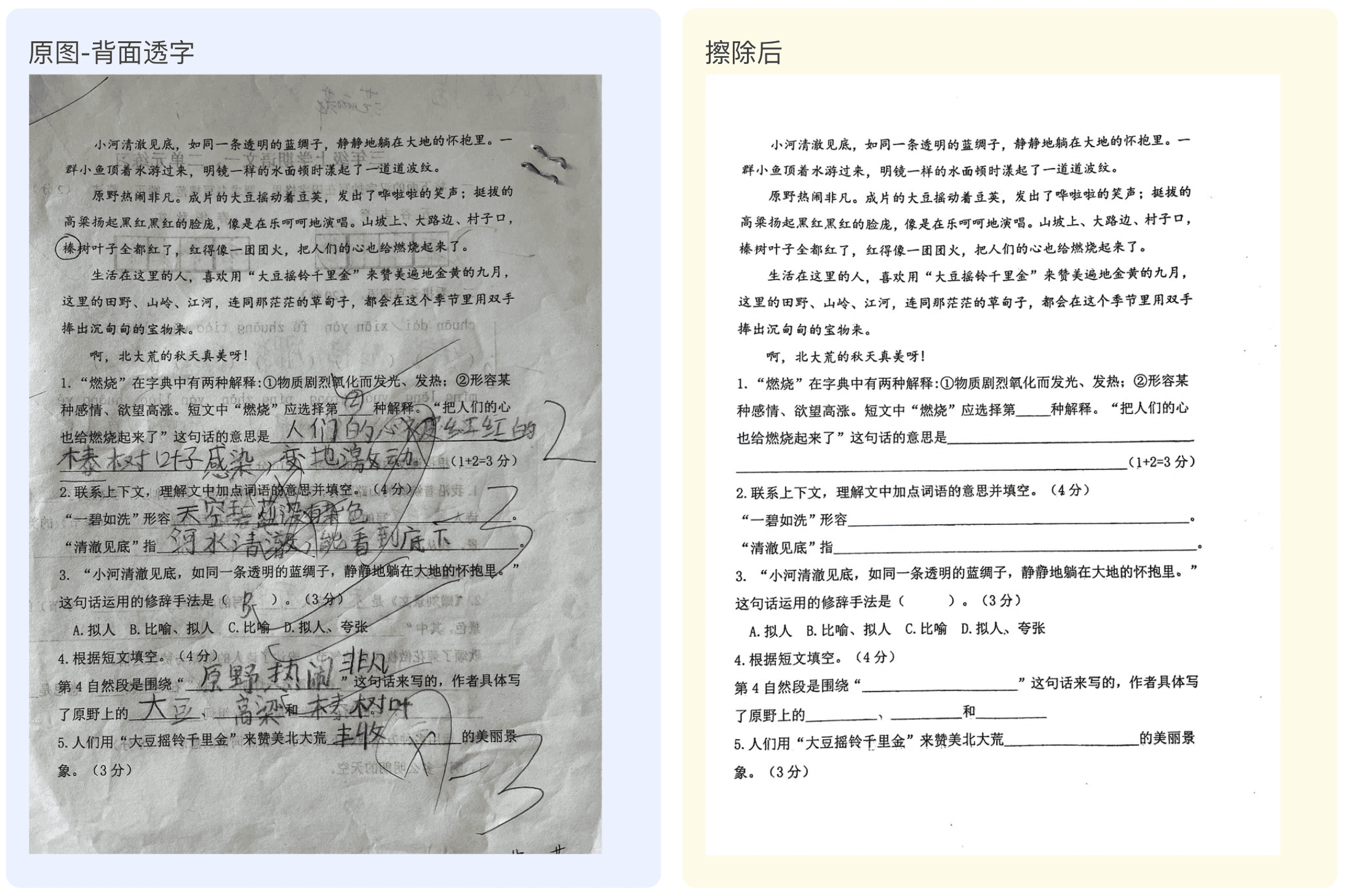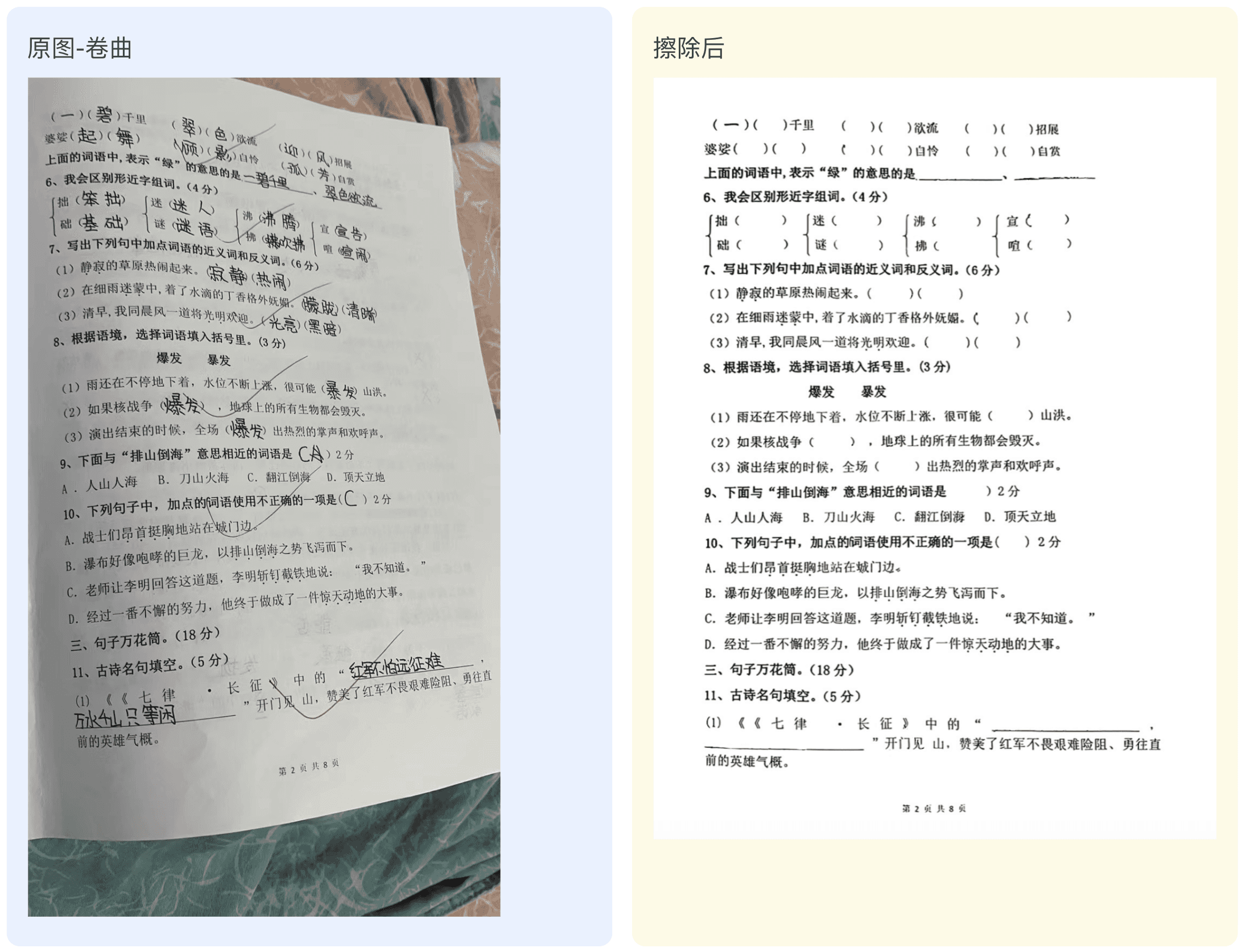 试卷擦除技术为您提供了一种高效、准确且可靠的方式来处理试卷。无论是考试卷、练习卷还是教材中的练习题,您只需上传图像,我们的技术会自自动识别试卷,去除无关背景,纠正倾斜,展平曲面,去除手写笔迹/批改痕迹,保留机打文字,输出一份干净整洁的空白试卷。